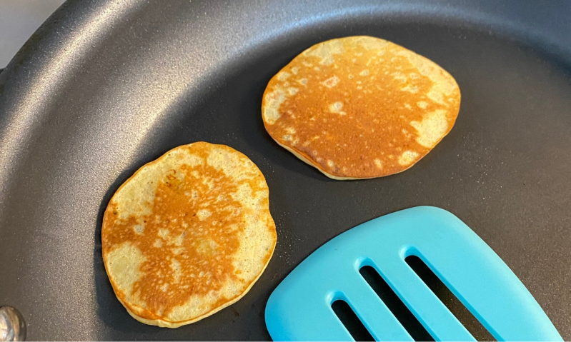 - Cook pancakes until bubbles form, flip and cook until browned on both sides